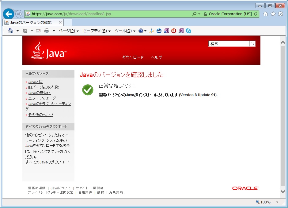 1. Javaのテストページ(http://java.com/ja/download/installed.jsp)にアクセスし、[Javaバージョンの確認]ボタンを押してください。