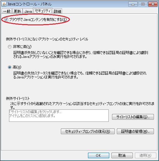 2. [セキュリティ]タブを選択し、[ブラウザでJavaコンテンツを有効にする]にチェックを入れます。