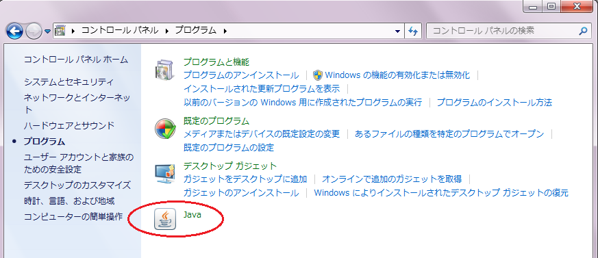 [スタート]→[コントロールパネル]→[プログラム]→[Java]アイコンをクリック