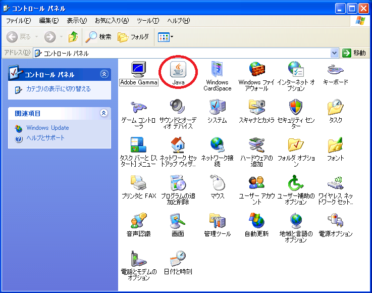 [スタート]→[コントロールパネル]→[クラシック表示に切り替える]→[Java]アイコンをクリック