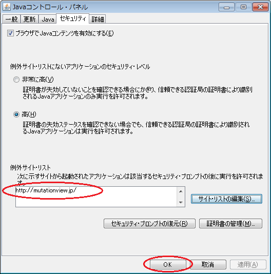6. [例外サイト・リスト]にMutationViewのURL(http://mutationview.jp/)が追加されたことを確認し、[OK]をクリックします。