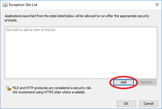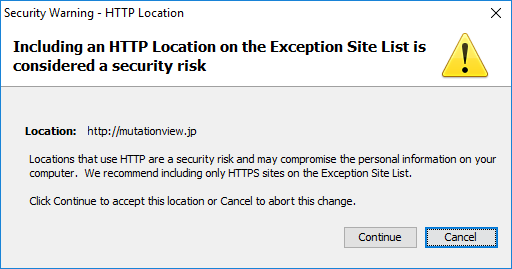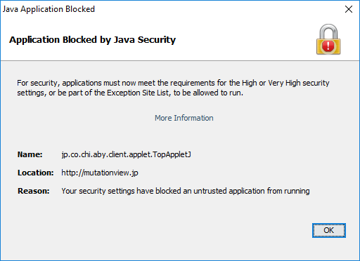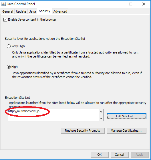 If the application block error is displayed when you accessed MutationView top page, you can avoid the error by setting the exception site list in the Java Control Panel.