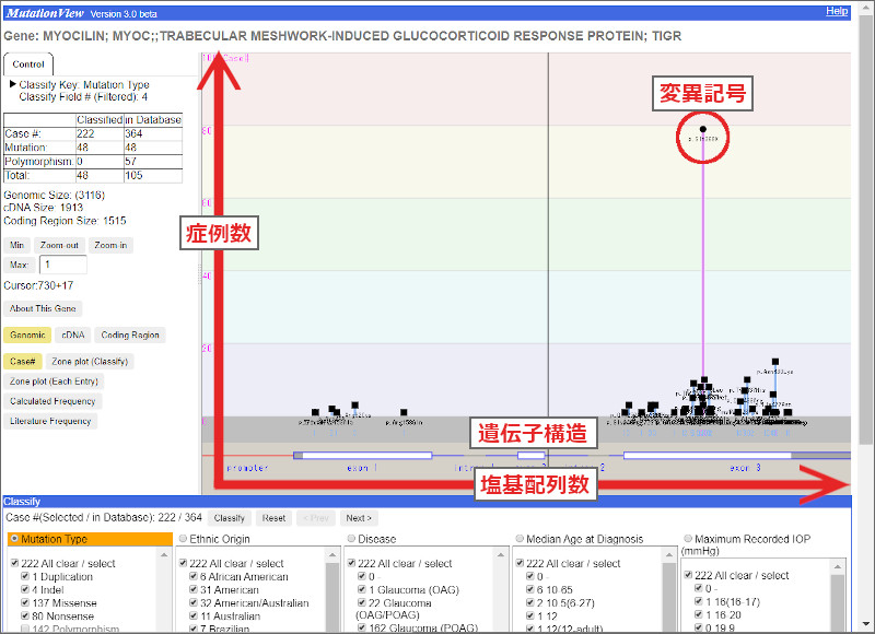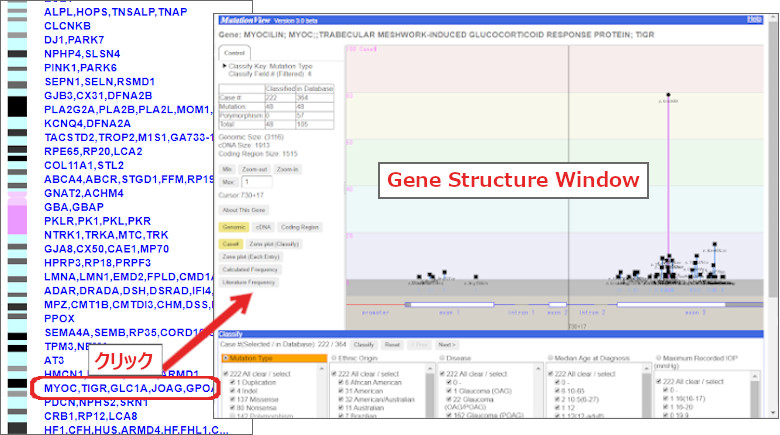 Gene Structure Window下部の[Classify]で、症例付加情報から症例の絞り込みや症例数の集計を行うことができます。