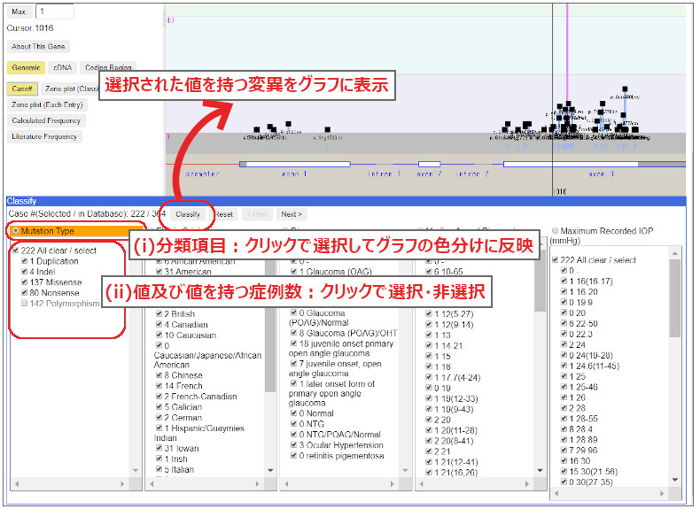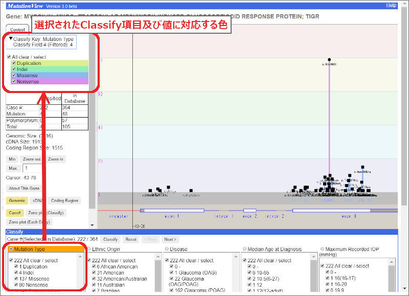 (i)変異付加情報の分類と、(ii)分類の各値を持つ変異の症例数を示します。 付加情報の値を選択し[Classify]ボタンを押すと、選択された値を持つ変異に絞り込まれてグラフに表示されます。