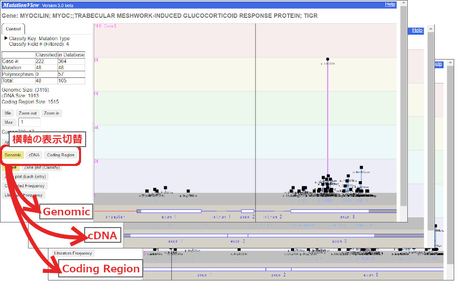 [Control]タブの[Genomic]、[cDNA]、[Coding Region]ボタンで、横軸をcDNAやCoding Regionへ切り替えることができます。