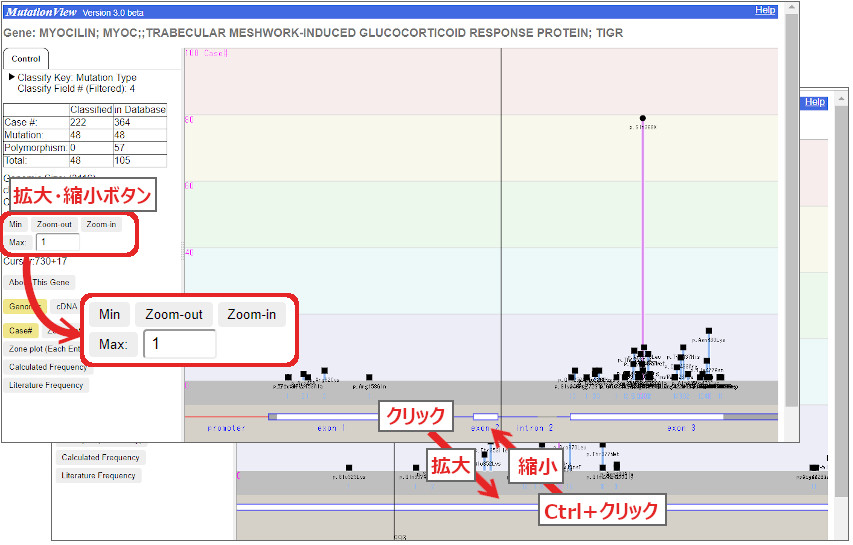 遺伝子構造上でクリックすると1段階拡大されます。[Ctrl]+クリックで1段階縮小されます(タブレット端末、スマートフォンではこの操作はできません)。最大拡大で塩基配列が表示されます。ウィンドウ左の[Control]タブのボタンでも拡大・縮小ができます。