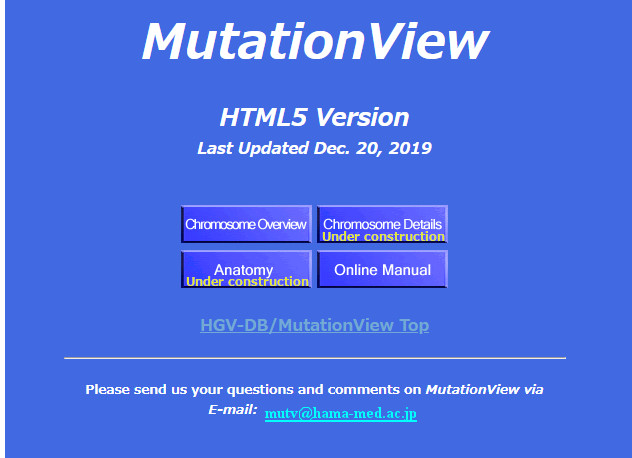 MutationViewのトップページで[HTML5 Version]を選択すると、HTML5バージョンのスタート画面が表示されます。この画面から検索方法を選択します。 全染色体入力遺伝子一覧メニューから検索する場合は[Chromosome Overview]ボタンを、疾患原因遺伝子がマップされている染色体から検索する場合は[Chromosome Details]ボタンを、疾患発症部位から検索する場合は[Anatomy]ボタンを押します。