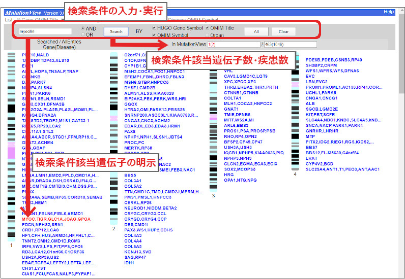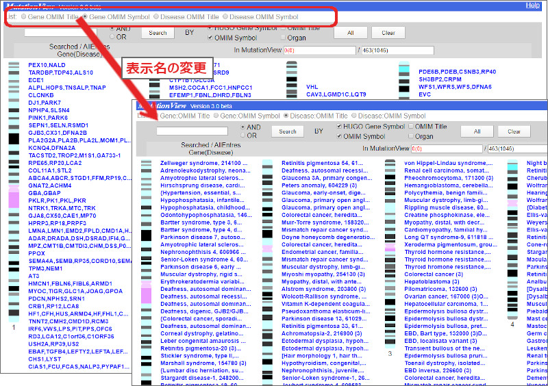 ・画面上部の[List]で遺伝子の一覧表示を、遺伝子のOMIM Title、遺伝子関連疾患のOMIM Title、OMIM Symbolに切り替えることができます。