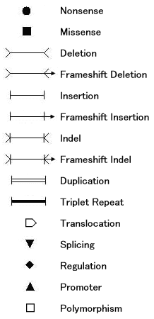 ヒストグラムの先端にある記号は変異の種別を示します。
