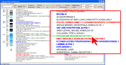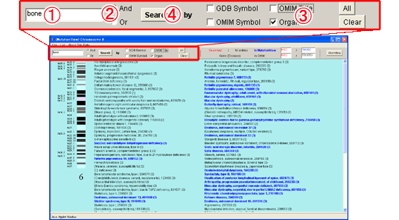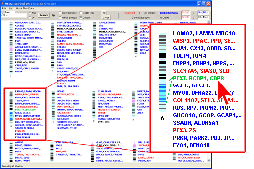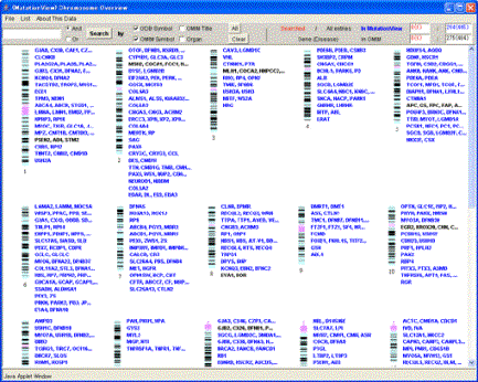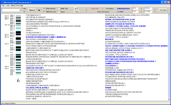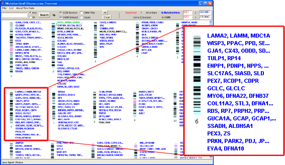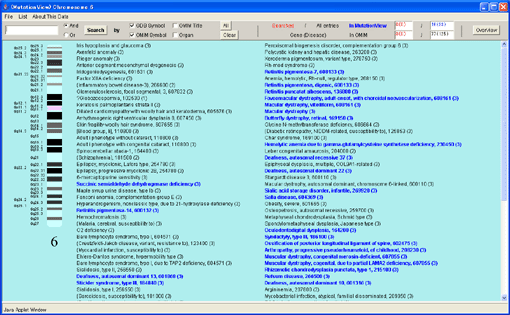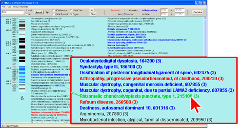 (1) 染色体イディオグラムを表示し、疾患遺伝子のマップを一覧表示します。それらのOMIM情報も表示できます。