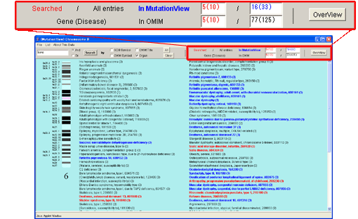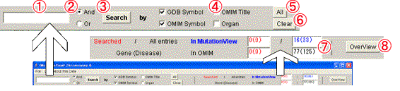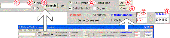 (7) 検索数・登録数表示フィールド:上段の[In MutationView]は、この染色体でMutationViewに登録されている遺伝子数(青色の数字。カッコ内は疾患数。)とそのうち検索条件に該当する遺伝子数(赤色の数字。カッコ内は疾患数。)を表示します。下段の[In OMIM]はこの染色体でOMIMに登録されている疾患遺伝子数(黒色の数字。カッコ内は疾患数。)と、そのうち検索条件に該当する遺伝子数(赤色の数字。カッコ内は疾患数。)を表示します。
