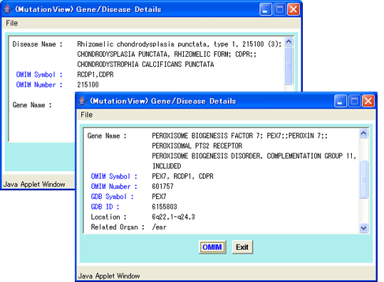 疾患名詳細ウィンドウは疾患名、OMIM記号、OMIM番号と、疾患の原因となる遺伝子の遺伝子名、OMIM記号、OMIM番号、GDB記号、GDB番号、染色体マップ領域及び疾患発症器官を表示します。ウィンドウ下部[OMIM]ボタンを押すと、NCBIにリンクし該当するOMIMエントリーを表示します。[Exit]ボタンを押すとこのウィンドウを閉じます。