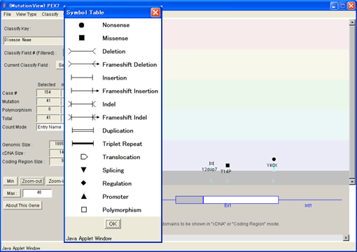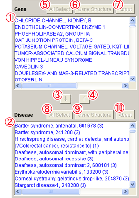 ウィンドウ下部のボタンは遺伝子構造ウィンドウの表示や他のデータベースへのリンクボタンです。[OMIM]ボタンを押すと、NCBIにリンクし該当するOMIMエントリーを表示します。同様に[GDB]ボタンを押すとGDBにおける該当するエントリーにリンクし、[HGMD]ボタンを押すとHGMDおける該当するエントリーにリンクし、[HGBASE]ボタンを押すとHGBASEおける該当するエントリーにリンクします。[Gene Structure]ボタンを押すと遺伝子構造ウィンドウ(後述6.)を表示します。[Exit]ボタンを押すとこのウィンドウを閉じます。