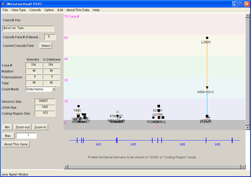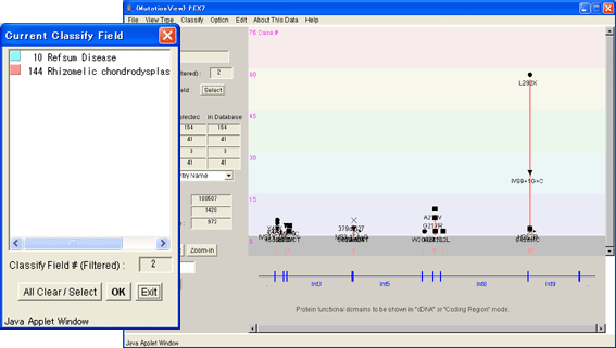 デフォルトの遺伝子構造ウィンドウでは変異種別によって変異の分類が行われています。クラシファイ機能によって分類項目を変更し、疾患によって変異情報を表示する例を示します。