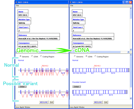遺伝子病や癌などの遺伝子の変異により生じる疾患は4,300種以上報告されています。それらの原因遺伝子の追究がゲノム解析の一環として精力的に進められており、現在特定染色体にマップされたものは約1,400種、原因遺伝子の同定及び変異の実体まで明らかにされたものは約800種あります。しかし、このような遺伝子変異データは、個々の研究者が様々な形式及びソフトウェアを用いて独立に蓄積しているのが現状です。また、それらの大多数は塩基配列変化等の文字データを蓄積したものに過ぎません。遺伝子変異データの効率化、体系的利用のためには、それらを統一し、同じ利用環境で使えるようにするとともに、OMIM、GDB、配列データベース等も利用して、データ項目間を有機的に結んだビジュアル的な表現が必要不可欠です。