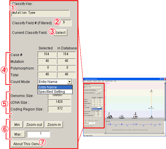 (4) 変異数表示フィールド:以下の項目について、[Selected]ではクラシファイで設定されている条件における数を、[in Database]ではMutationViewに登録されている数を表示します。