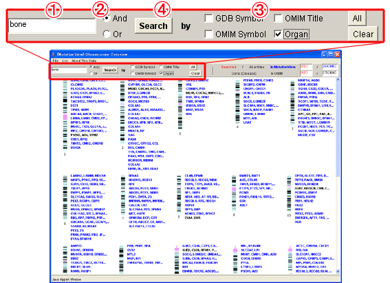 ウィンドウ上部にある検索ツールバーを用いると遺伝子名、疾患名、発症部位によって遺伝子名/疾患名リストの中から目的とする遺伝子を検索することができます。