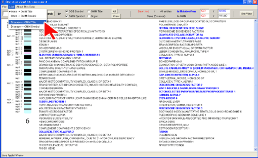 [List]メニューで[Disease->OMIM Title]を選択すると、この染色体にマップされている単一遺伝子疾患の疾患名の一覧が表示されます(後述5.2.3)。疾患名を右クリックすると疾患名詳細ウィンドウ(前述5.1.4)が表示されます。疾患名は、[List]メニューで[Disease->OMIM Symbol]を選択すると疾患のOMIM記号に変更されます。