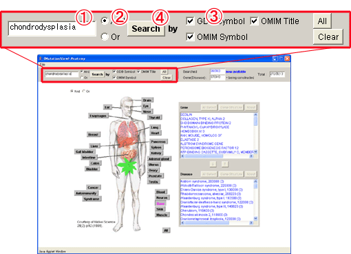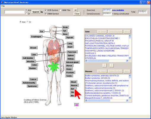 スタート画面で[Anatomy]ボタンを押すとAnatomyメニューが現れます。Anatomyメニューでは人体模式図に器官名、組織名のボタンを配置しており、疾患発症部位から疾患原因遺伝子や疾患の検索を行うことができます。