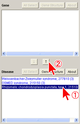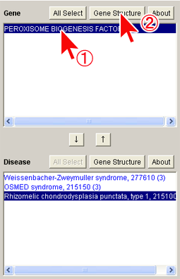 キーワードに該当した疾患の中から目的の疾患”Rhizomelic chondrodysplasia・・・”にマウスカーソルを合わせクリックします。すると遺伝子構造ウィンドウが表示されます。