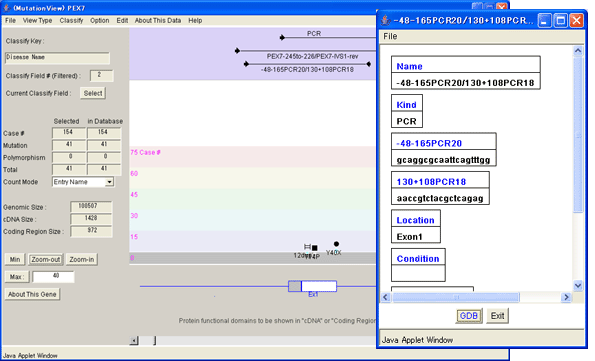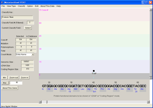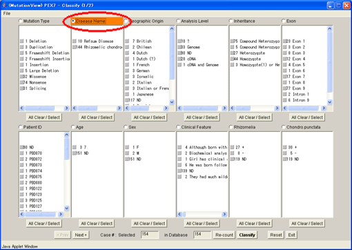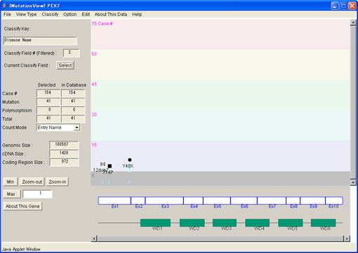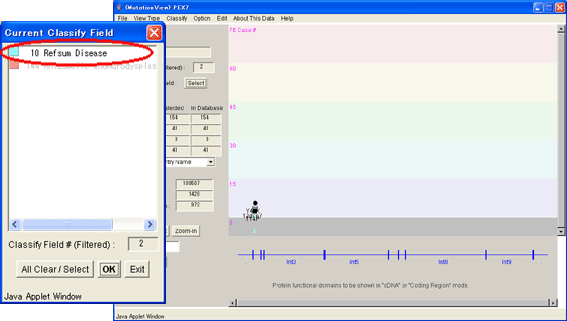 PEX7には“Disease Name”という分類項目があります。分類項目を“Disease Name”に変更し疾患に着目して変異を表示させることにします。[Classify]ボタンを押して変更した分類で遺伝子構造ウィンドウを表示させます。
