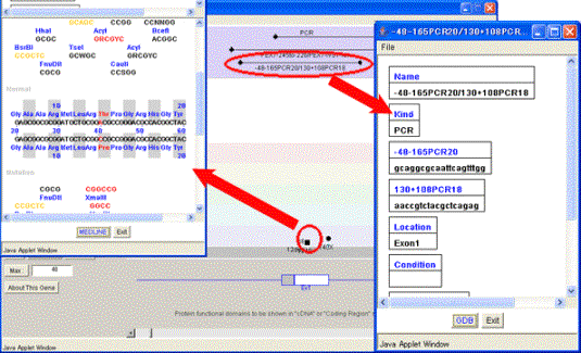 遺伝子名詳細ウィンドウは遺伝子に関する情報を表示するウィンドウです。遺伝子名、遺伝子のOMIM記号、OMIM番号、GDB記号、GDB番号、染色体マップ領域、疾患発症器官等の遺伝子に関する情報と、この遺伝子を原因とする疾患の疾患名、OMIM記号及びOMIM番号を表示します。