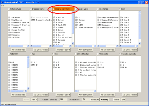 選択された種別に属する変異が新たに作られたグループ“European”のゾーンに表示されています。ツールバーの[Current Classify Field]の[Select]ボタンを押すとグループ“European”が作られています。