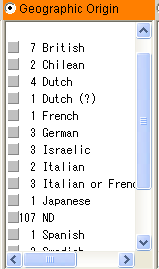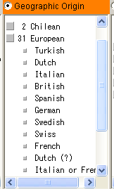 分類項目の種別は予め決められていますが、ユーザーが複数の種別をまとめたグループを作ることができます。クラシファイウィンドウの項目“Geographic Origin”に属する種別をまとめてグループを作る例を挙げます。