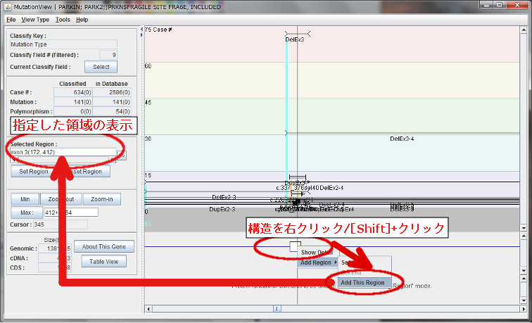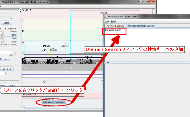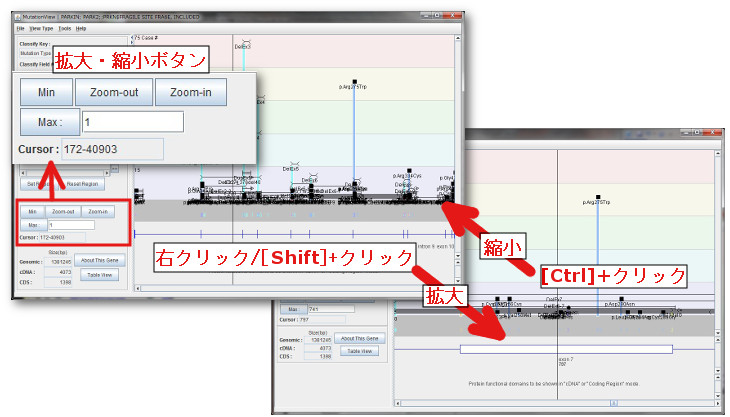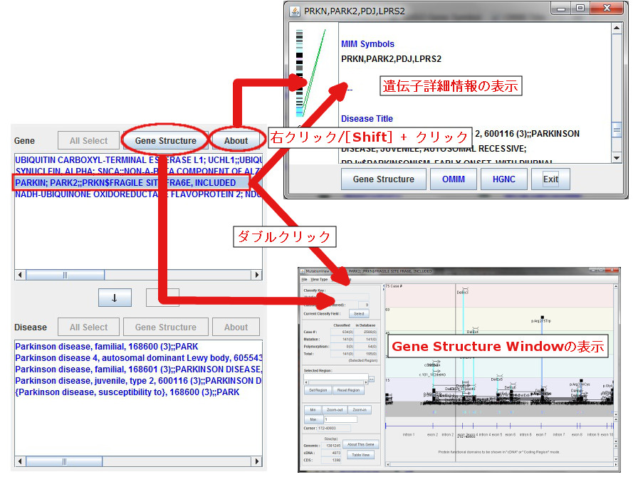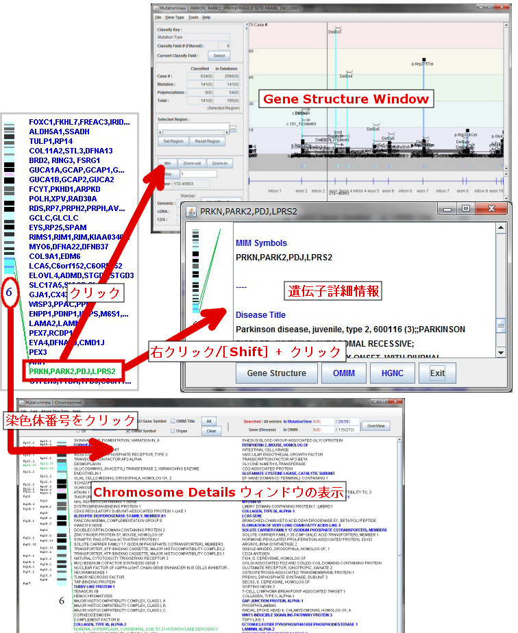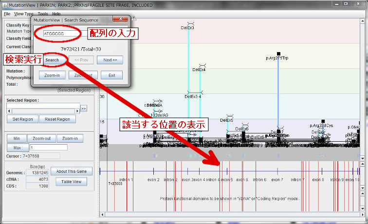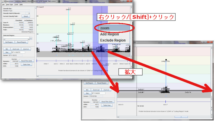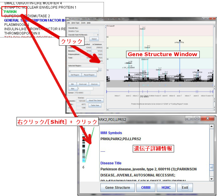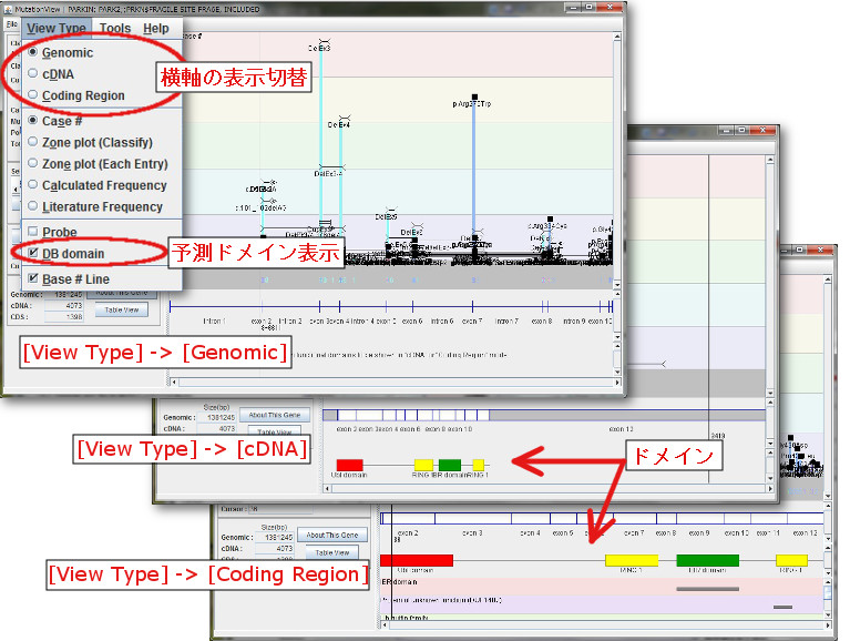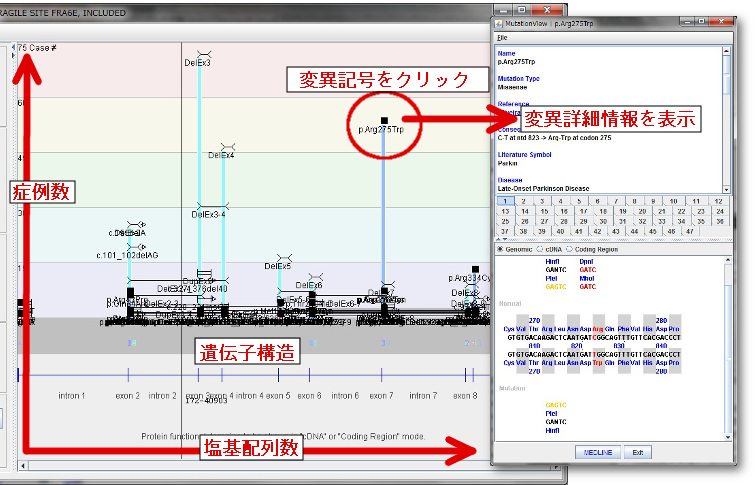 遺伝子の変異・多型情報を、遺伝子構造、ドメイン構造、塩基配列とともにグラフィカルに表示します。