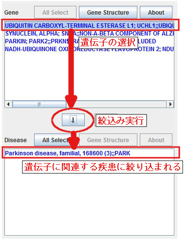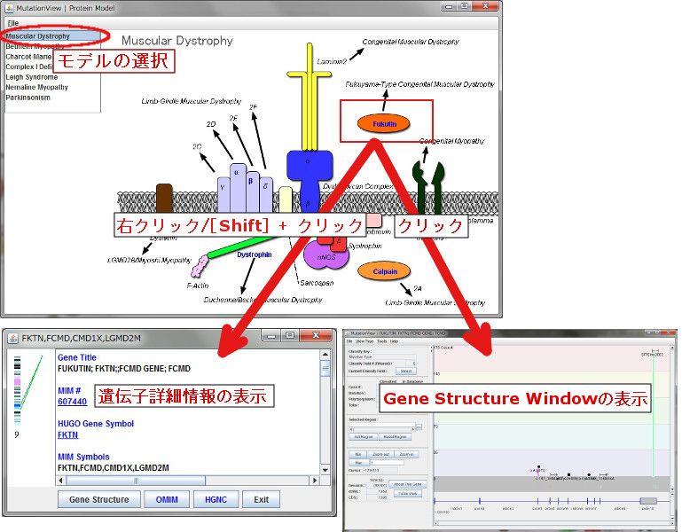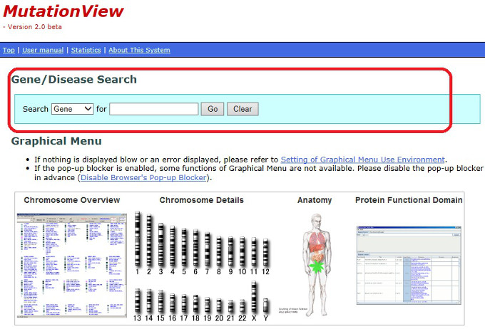 染色体イディオグラム、人体解剖図、タンパク質モデル図等とともに、それらの詳細部位に対応する遺伝子を示します。図から遺伝子や疾患を選択すると、遺伝子のGene Structure windowが表示されます。 なお、Graphical Menuの使用にはJavaのインストールが必要です。Graphical Menuの図が見えない場合、JavaがインストールされていないかブラウザでJavaが有効になっていない可能性があります。 Javaのインストールと有効化を参考にしてJavaが有効になるように設定してください。 ※Graphical Menuにおいて、マウスの右クリックの操作は、[Shift]+(左)クリックに置き換えることができます。