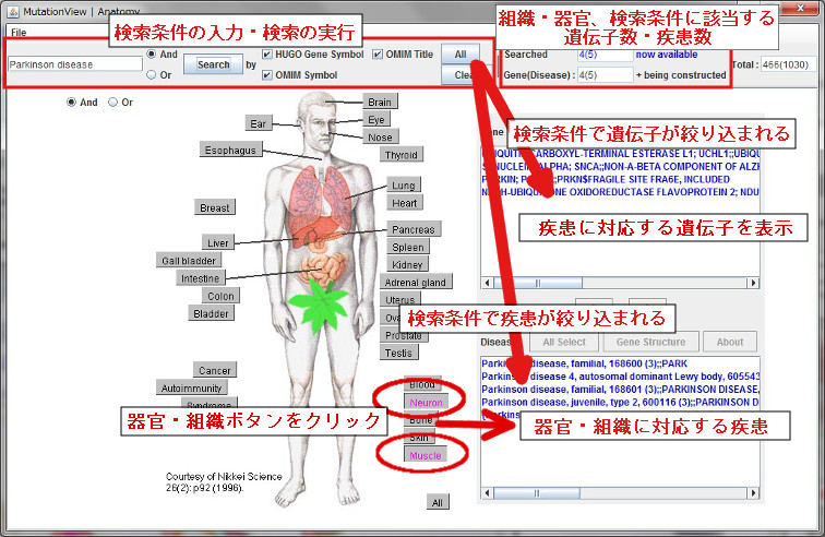 解剖図に器官名、組織名のボタンを配置しており、疾患発症部位から疾患原因遺伝子や疾患の検索を行うことができます。