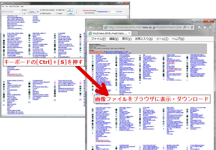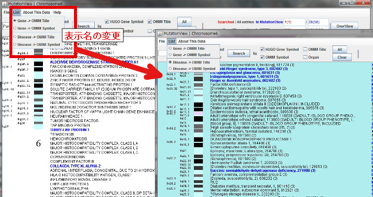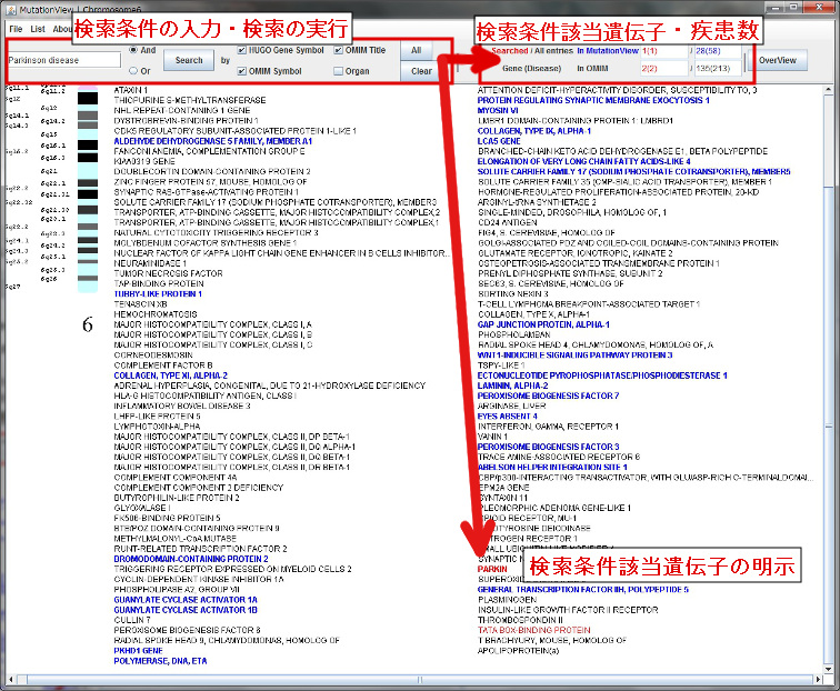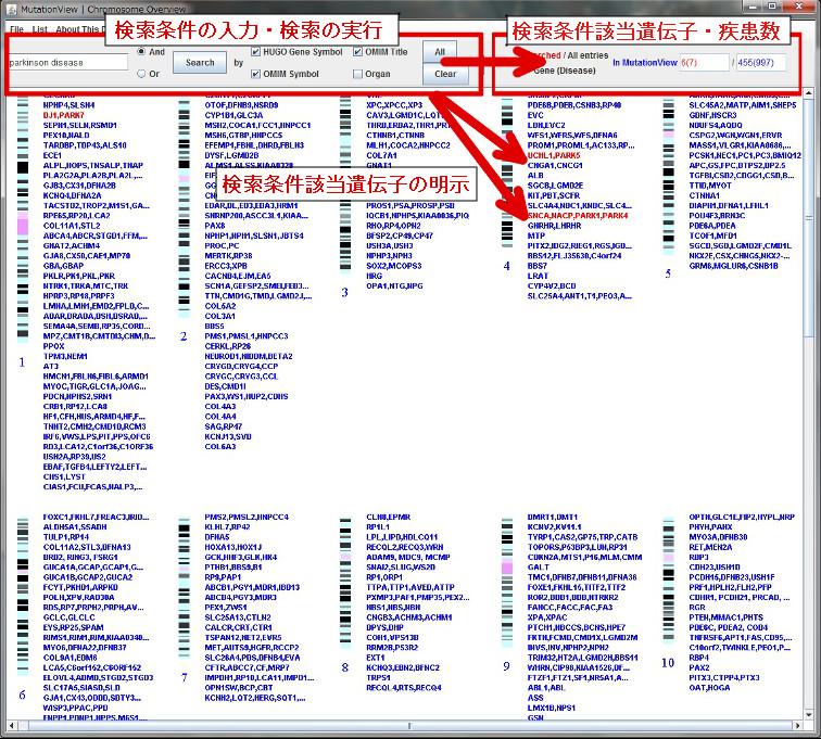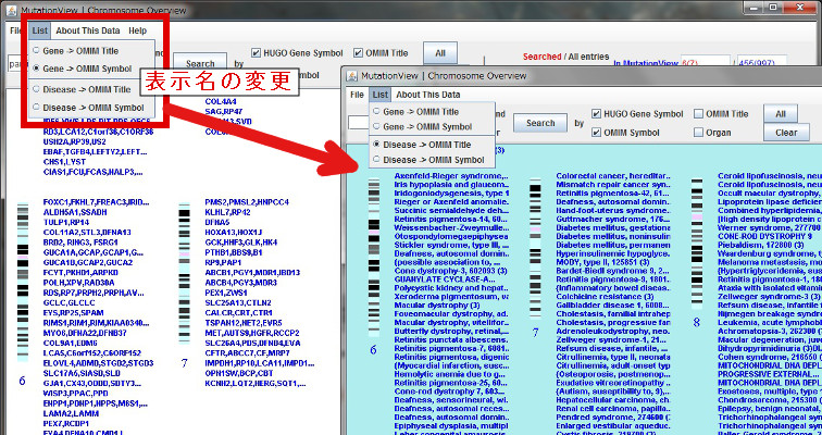染色体上に存在する単一遺伝子疾患原因遺伝子を表示します。青色の遺伝子はMutationViewに登録されているものです。