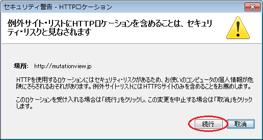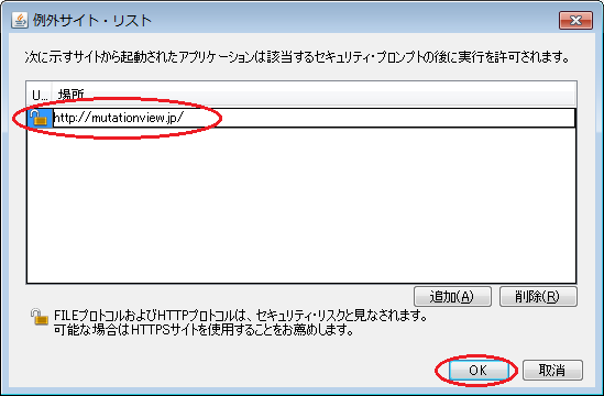 6. [例外サイト・リスト]にMutationViewのURL(http://mutationview.jp/)が追加されたことを確認し、[OK]をクリックします。
