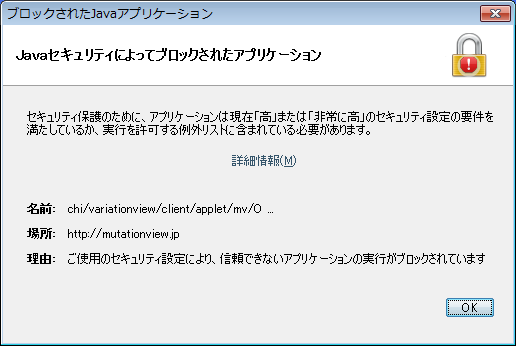 2014年1月リリースのJava 7 Update 51より、Javaのセキュリティ設定が厳しくなり、MutationView Javaバージョンがブロックされ起動できない現象が生じます(下の図参照)。