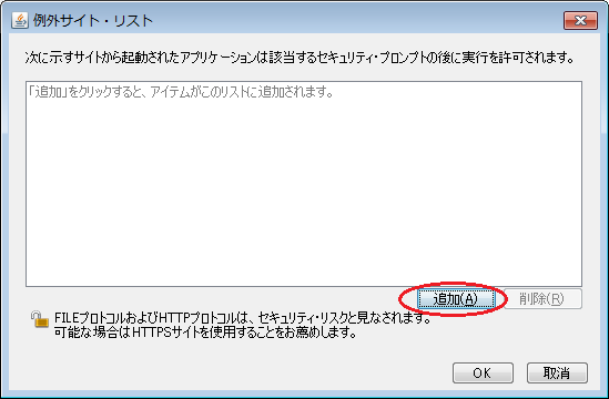 3. [例外サイト・リスト]ウィンドウで[追加]をクリックします。
