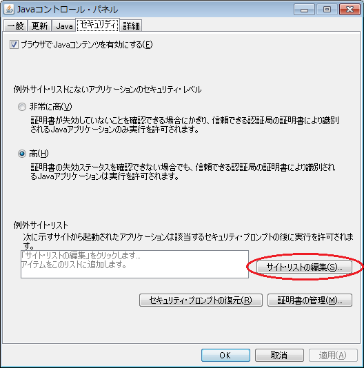 2. [セキュリティ]タブを選択し、[サイト・リストの編集]をクリックします。
