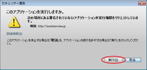 以下のようにJava検出アプリケーションの実行の許可が求められた場合、[実行]ボタンを押してください。
