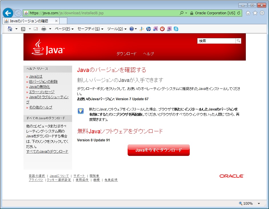 1. Javaのテストページ(http://java.com/ja/download/installed.jsp)にアクセスし、[Javaバージョンの確認]ボタンを押してください。