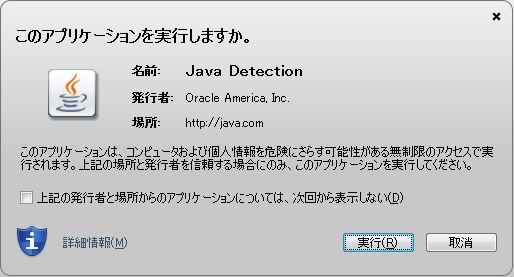 以下のようにJava検出アプリケーションの実行の許可が求められた場合、[実行]ボタンを押してください。