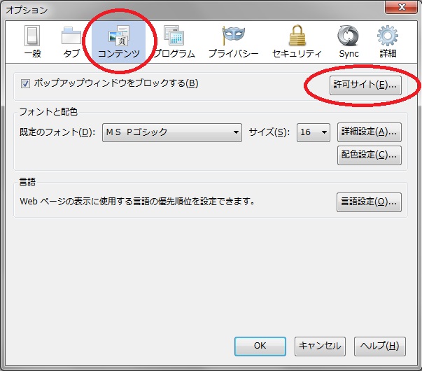 2. [オプション]ウィンドウで[コンテンツ]を選択し、[ポップアップウィンドウをブロックする]にチェックが入った状態で、[許可サイト]ボタンを押します。