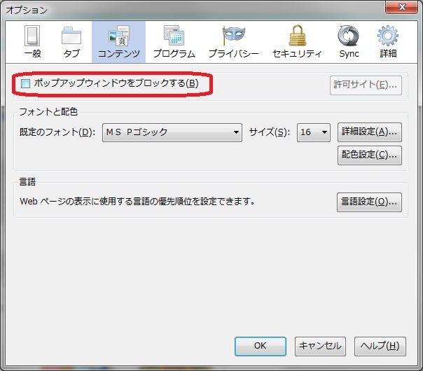 2. [オプション]ウィンドウで[コンテンツ]を選択し、[ポップアップウィンドウをブロックする]のチェックを外します。[OK]ボタンを押します。