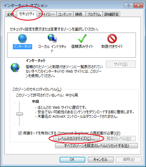 1. [ツール]→[インターネットオプション]を選択します。 2. [セキュリティ]タブ→[レベルのカスタマイズ]ボタンを押します。
