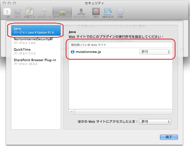 5. [Java]を選択し、現在開いているWebサイト]中の“mutationview.jp”横のプルダウンリストで[確認]、[許可]または[常に許可]を選択します。
