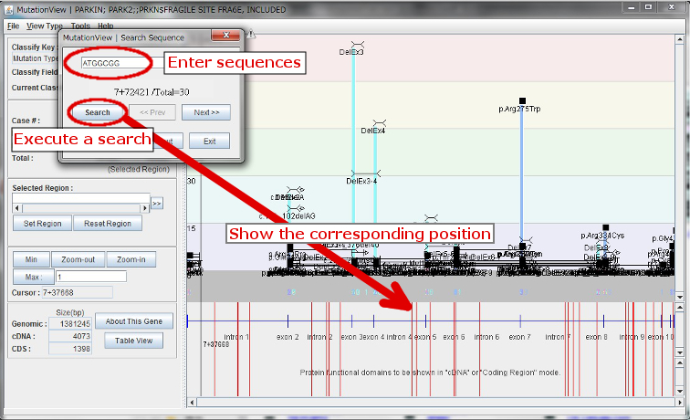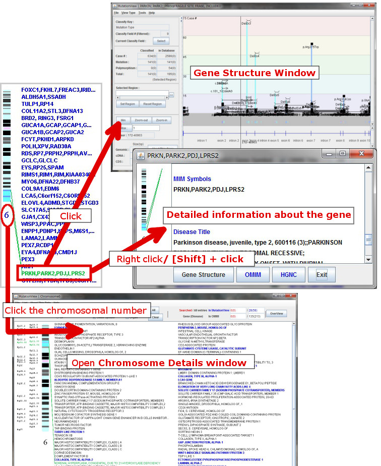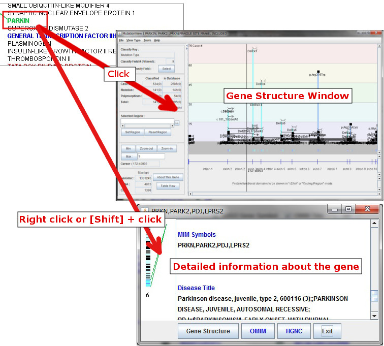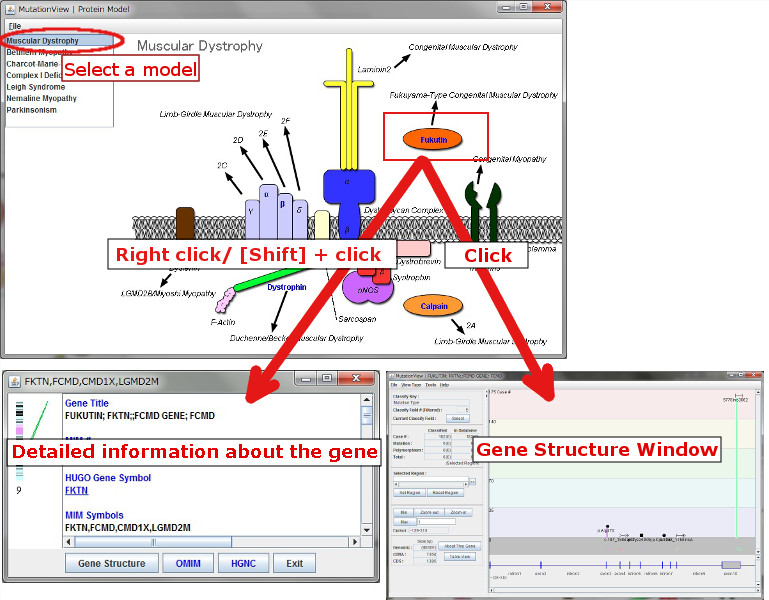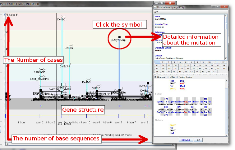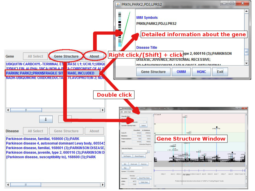 By clicking while the mouse cursor is over a gene, Gene Structure window displays graphical images of gene structure, sequences, variations, and symptoms of the selected gene.