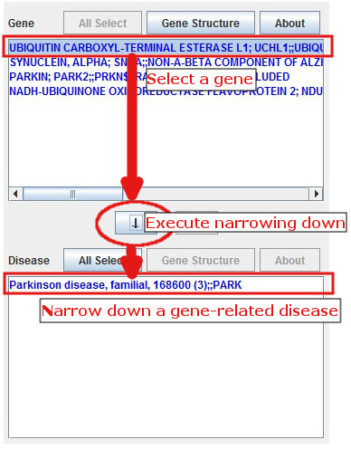 By selecting a target gene from the list of genes and clicking [↓] button, the list of diseases is narrowed down to the diseases related to the selected genes.