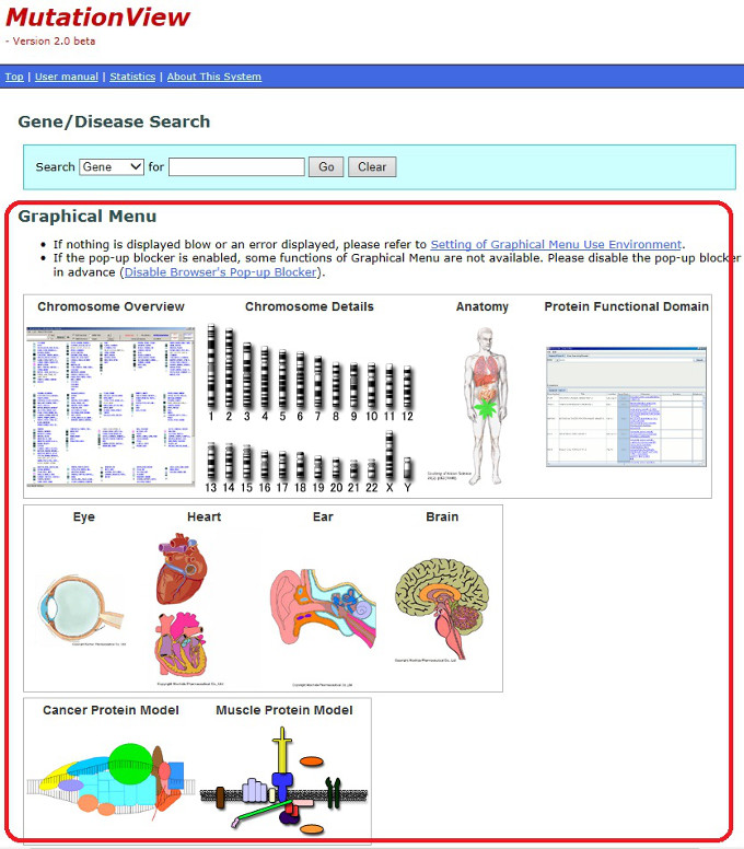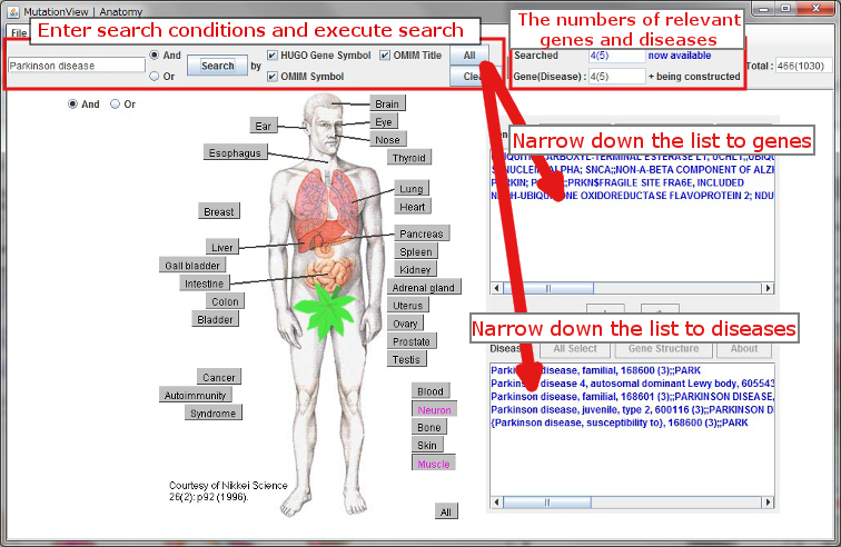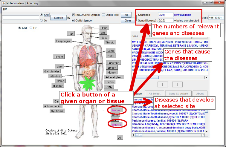 In the Anatomy Menu window, buttons showing names of organs and tissues are placed along the anatomical figure. You can search for diseases and disease-causing genes by selecting the buttons of diseased sites.