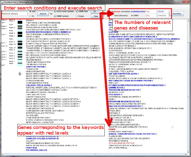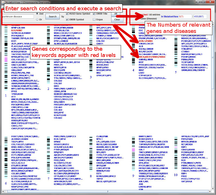 Select the target field to utilize for search from HUGO Gene Symbol, OMIM Title, OMIM Symbol or Organ, and enter your search terms. If you would like to specify more than one keyword, place a space between each word and choose AND search (search genes including all of the keywords) or OR search (search genes including at least one of the keywords). Click the [Search] button, and genes corresponding to the keywords appear with red labels. In addition, the numbers of the corresponding genes and diseases are shown at the upper right of the window.