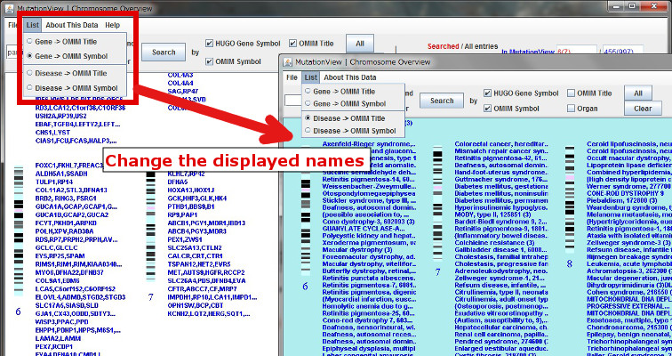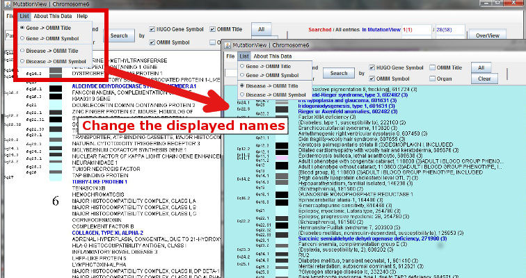 The displayed name of the gene is switchable to gene OMIM Symbol, related disease OMIM Title or related disease OMIM Symbol from the menu [List].