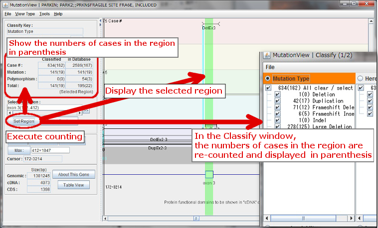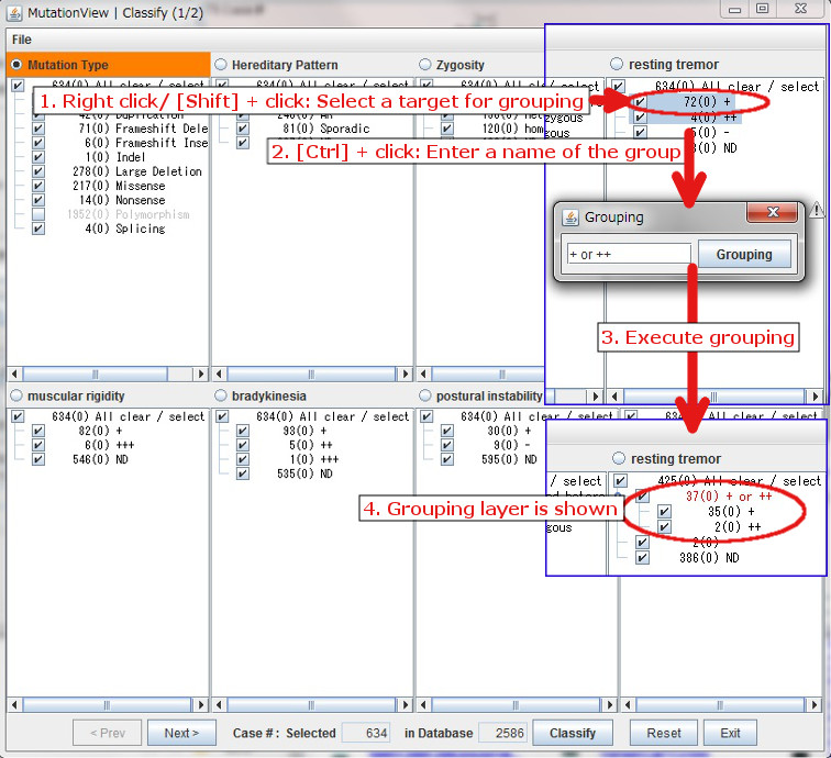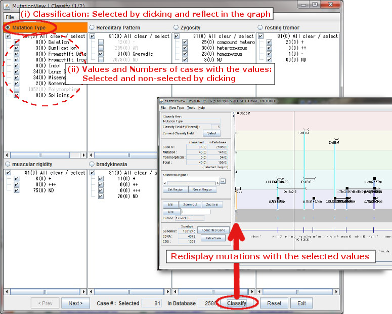 By clicking [Classify] button after a value is selected, mutations that include the selected values are shown in a graph.