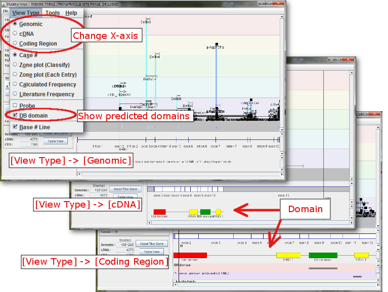 - By changing the structure of X-axis to cDNA or Coding Region from the menu [View Type], the domain is shown along with the structure.